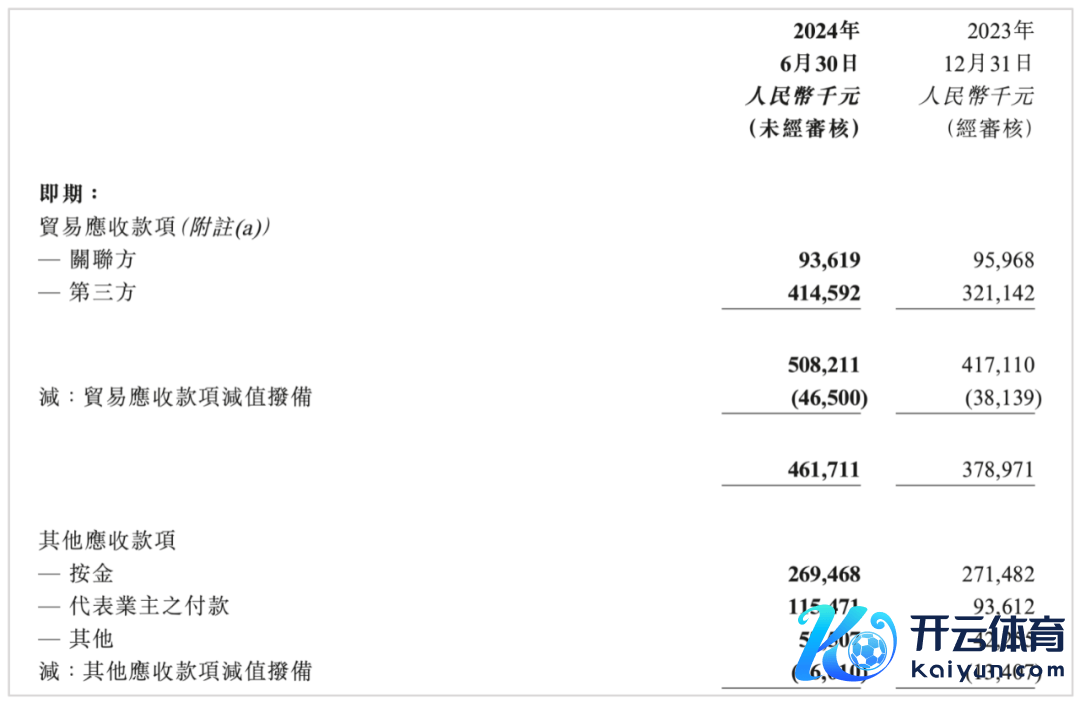 铁心2024年6月30日,德信工作的贸易应收款约为4.62亿元。其中,自关联方的部分为9361.9万元,较年头减少234.9万元;来自第三方的部分为4.15亿元,较年头加多约9400万元。